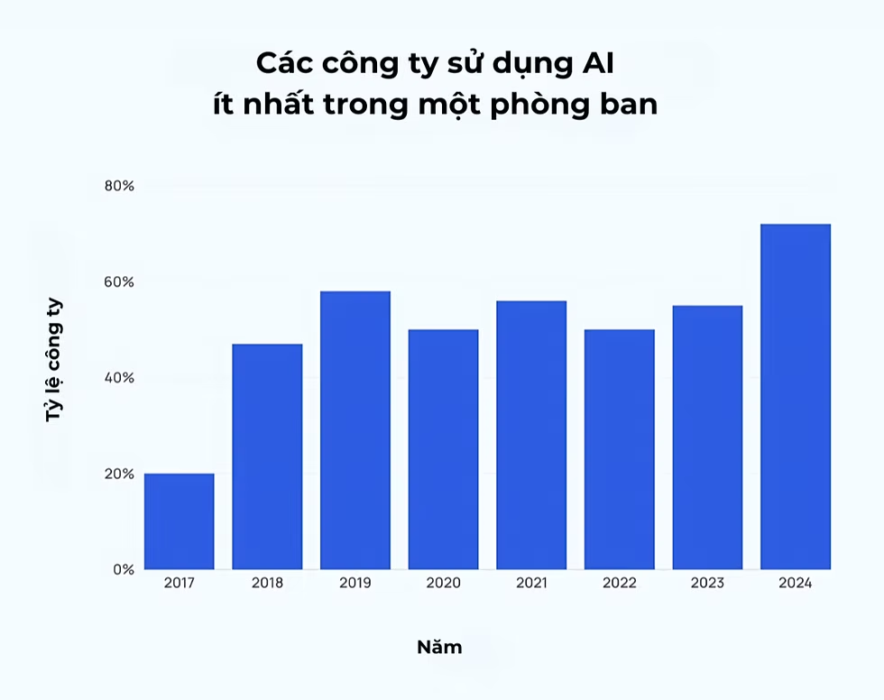 Trong thời đại số hóa, Trí tuệ nhân tạo (AI) đang trở thành một trong những công nghệ có ảnh hưởng mạnh mẽ nhất, không chỉ hỗ trợ giải quyết những vấn đề trong cuộc sống hằng ngày mà còn cách chúng ta làm việc và cách doanh nghiệp vận hành. Theo một báo cáo của McKinsey, việc ứng dụng AI vào công việc một các hiệu quả có thể nâng cao năng suất lao động lên 40%. Hiện nay, 61% doanh nghiệp trên toàn cầu đã bắt đầu áp dụng AI trong các quy trình công việc (theo Gartner). Các công ty sử dụng AI hiệu quả đã ghi nhận lợi nhuận tăng trung bình 20-30% nhờ cải thiện quy trình và giảm chi phí vận hành.